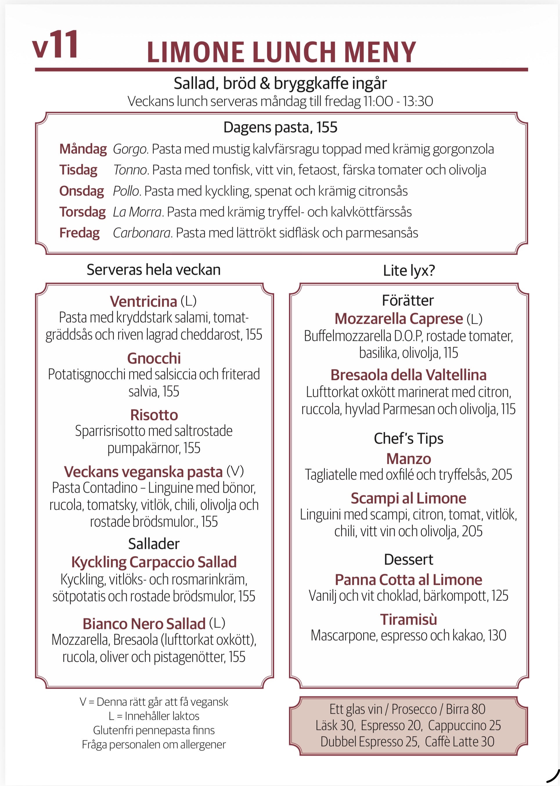 Äta lunch hos oss på Limone kostar 155 kr inkl sallad och kaffe.